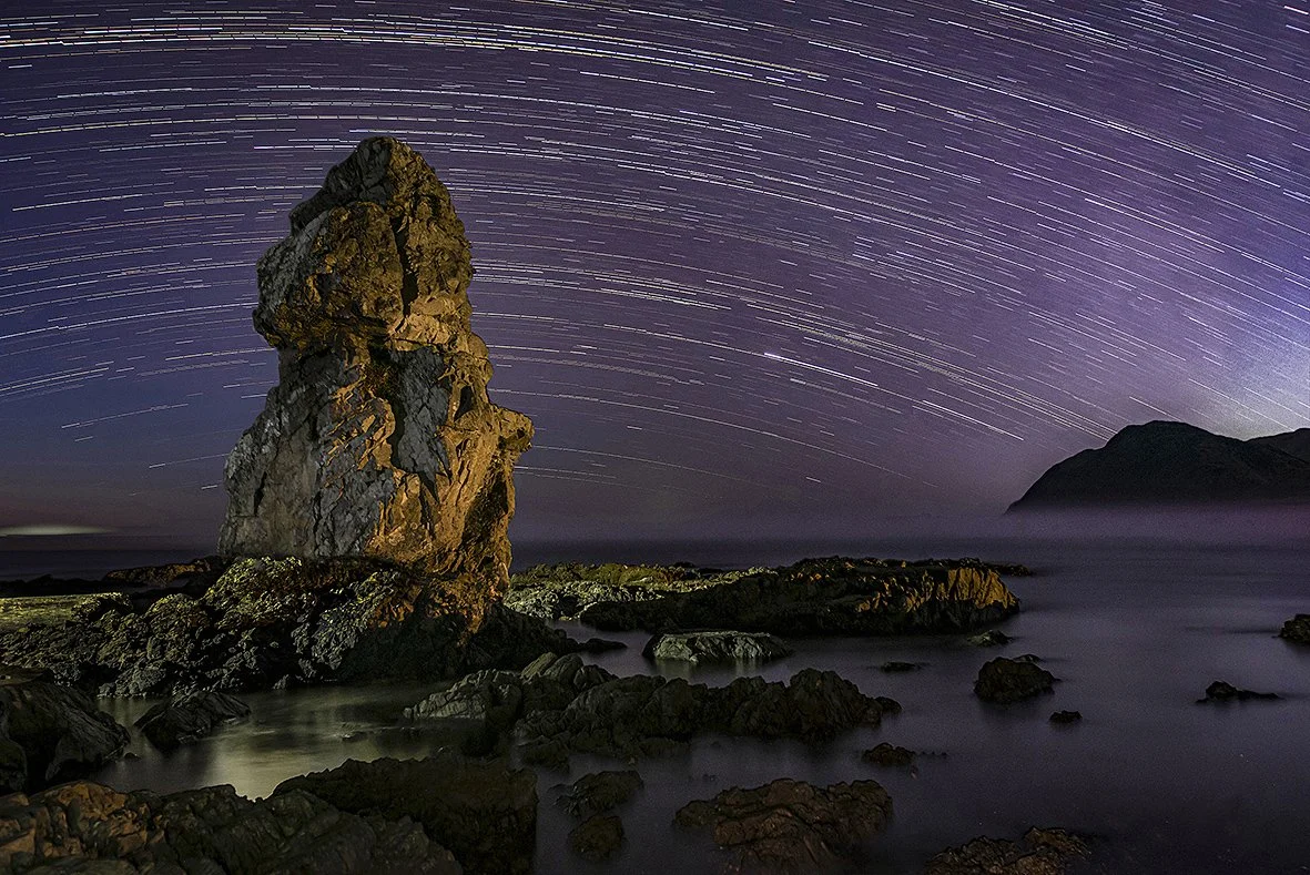 For this series, I worked with a Nikon D750 and a 20–35mm f/2.8 lens, shooting at either f/5.6 or f/4 with ISO settings between 100 and 800. Each final image is built from a series of 4–6-minute exposures.